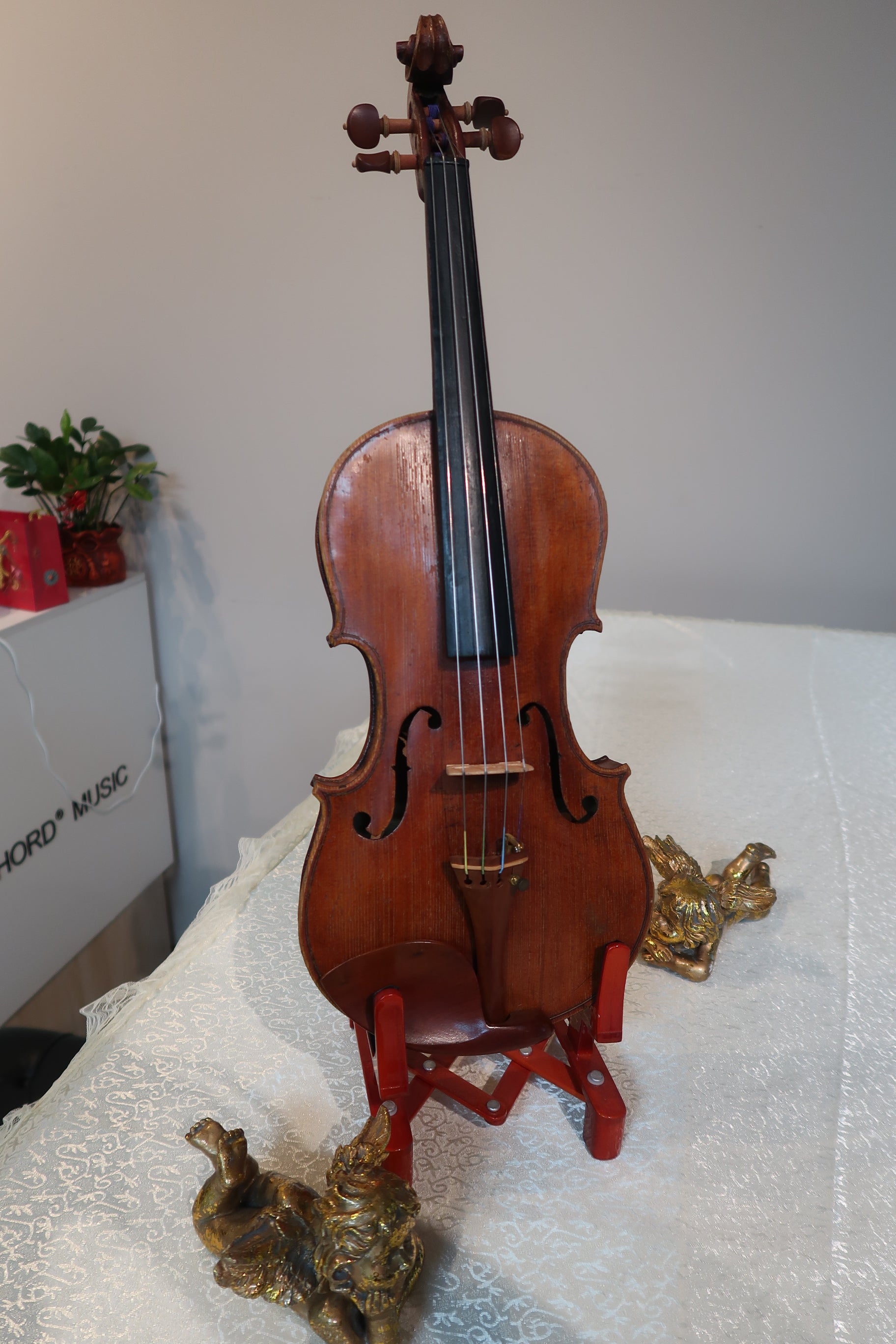 Este es un violín antiguo de taller alemán , bellamente envejecido, probablemente fabricado a finales del siglo XIX o principios del XX . Si bien no lleva etiqueta interna, la artesanía, la elección de materiales y la calidad tonal sugieren firmemente que proviene de un taller europeo especializado, posiblemente de Alemania, Austria o Bohemia .